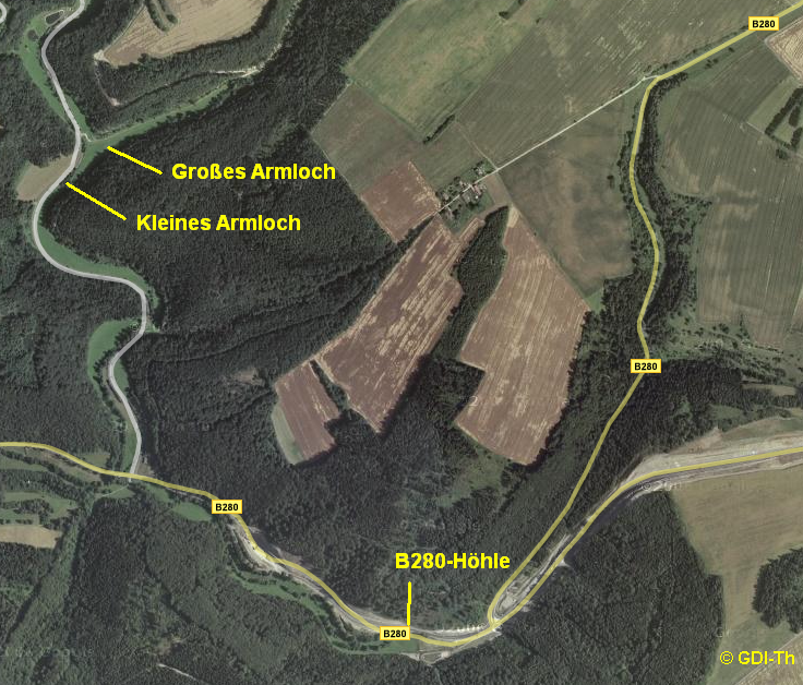 Das Große Armloch ist 1,543 km Luftlinie von der B-280-Höhle entfernt und der Wasserspiegel liegt bei Niedrigwasser 6,92 m tiefer als die B280. Bei Hochwasser, wenn das Große Armloch überläuft, beträgt die Höhendifferenz 3,55 m. Ein starker Waller im Quellbecken zeigt, daß sich das Wasser im Berg zurück staut. http://www.hfc-suhl.de/2021-04-14_Kleines_Armloch_Vers_1.mp4 Die Entwässerung des Gebietes (rote Pfeile) erfolgt Richtung Südwest. Armloch und B280 liegen auf ca. 350 m Höhe (NHN92) und der Dolmar mit 739 m Höhe (NHN92) . So ergibt sich ein -für Mittelgebirge- sehr großes Höhenpotential.
