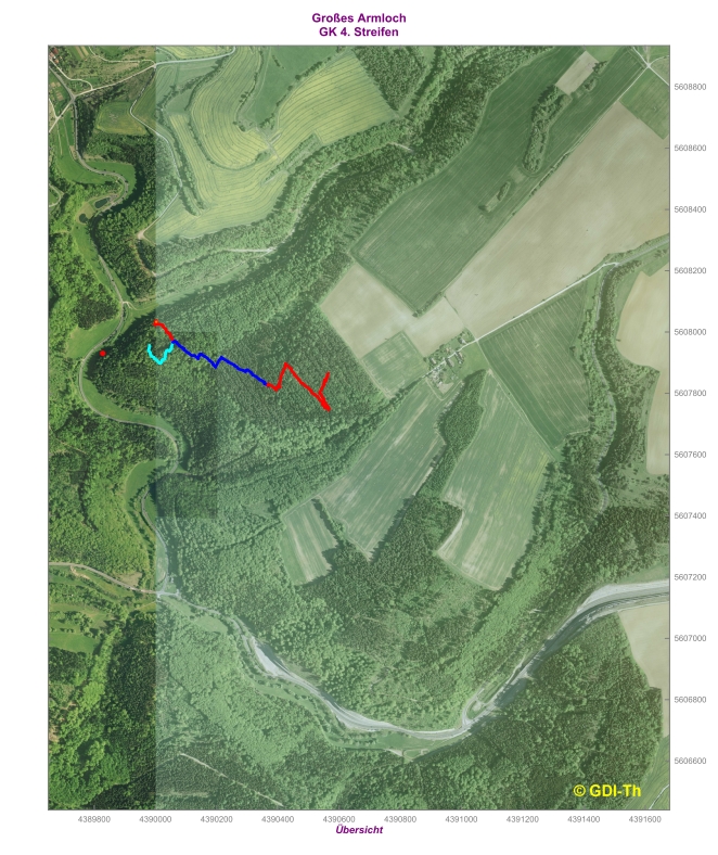 Das Große Armloch ist 1,543 km Luftlinie von der B-280-Höhle entfernt und der Wasserspiegel liegt bei Niedrigwasser 6,92 m tiefer als die B280. Bei Hochwasser, wenn das Große Armloch überläuft, beträgt die Höhendifferenz 3,55 m. Ein starker Waller im Quellbecken zeigt, daß sich das Wasser im Berg zurück staut. http://www.hfc-suhl.de/2021-04-14_Kleines_Armloch_Vers_1.mp4 Die Entwässerung des Gebietes (rote Pfeile) erfolgt Richtung Südwest. Armloch und B280 liegen auf ca. 350 m Höhe (NHN92) und der Dolmar mit 739 m Höhe (NHN92) . So ergibt sich ein -für Mittelgebirge- sehr großes Höhenpotential.